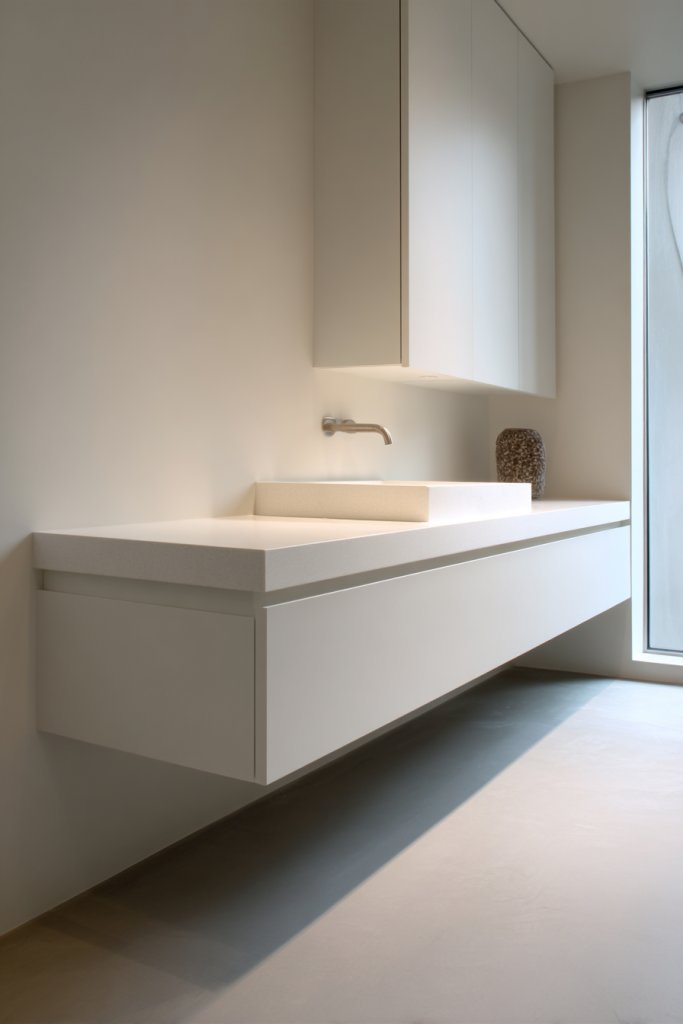 Picture a wall-mounted vanity with a smooth, matte finish and barely-there handles. The sleek surface is complemented by soft LED lighting underneath, casting a gentle glow. The absence of bulky legs or cabinetry makes the space seem larger while showcasing the wall’s texture. The clean lines and minimalist hardware create a sense of calm and order.