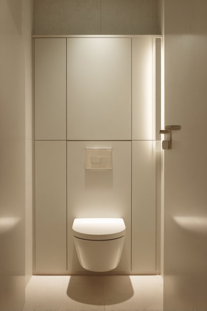 Imagine a wall with a hidden tank behind a smooth, flush surface. The toilet appears to float, with only the bowl visible, giving the bathroom a modern, airy feel. Soft lighting highlights the clean lines, while the concealed mechanism reduces visual noise. The overall effect is a high-end, spa-like atmosphere that exudes sophistication.