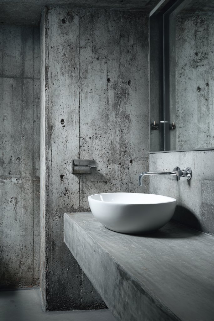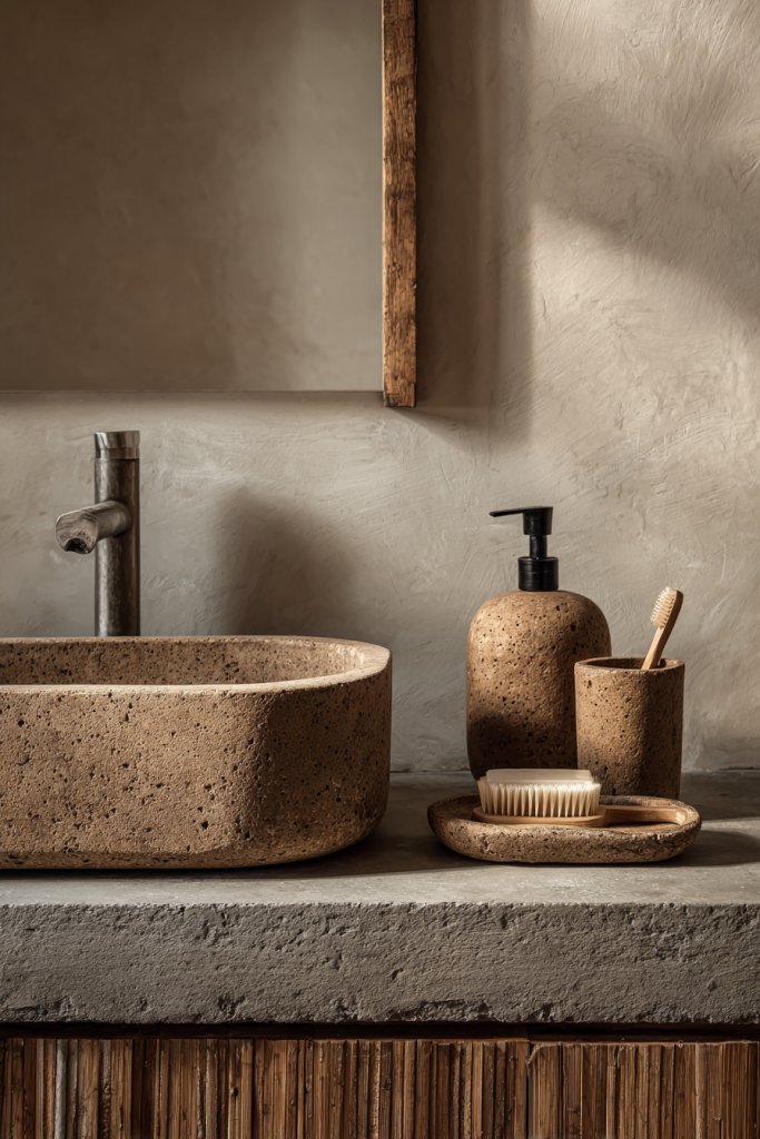 Picture textured concrete walls with subtle variations in tone and surface. The matte finish absorbs light, creating a subdued, sophisticated atmosphere. Accentuate with sleek fixtures and minimalist accessories to highlight the industrial aesthetic. The rough surface contrasts with smooth porcelain or glass elements, adding tactile richness.