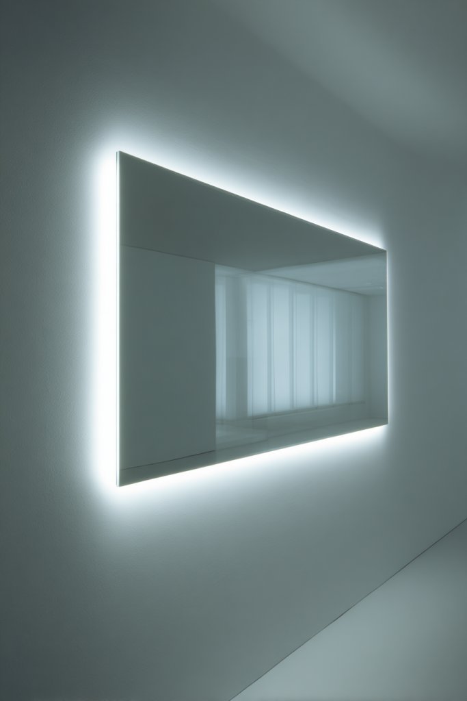 Imagine a large, edge-to-edge mirror seamlessly mounted on the wall, glowing softly from behind with integrated LED strips. The light creates a halo effect, highlighting your face and adding ambiance. The frameless design emphasizes clean lines and minimal clutter. The glow subtly accentuates textured walls or decorative finishes, elevating the entire space.