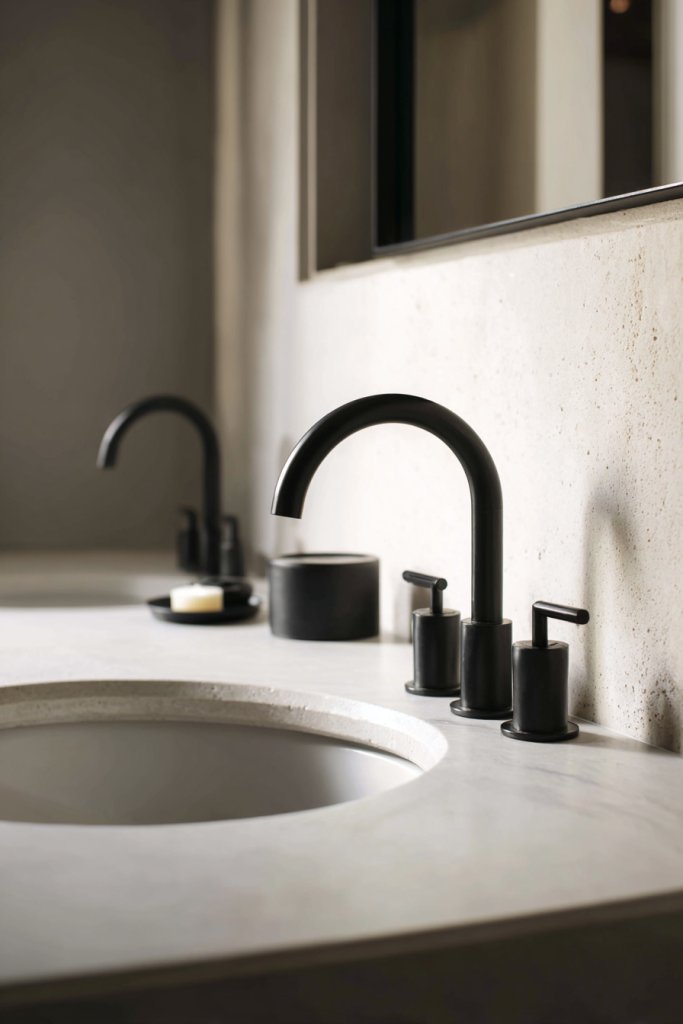Add sculptural soap dispensers or sleek toothbrush holders in matching matte black finishes. Incorporate textured towels or woven baskets to introduce tactile contrast. Play with lighting—like sconces or backlit mirrors—to highlight the fixtures’ matte finish. Small details like black faucet handles or drawer pulls tie the look together.