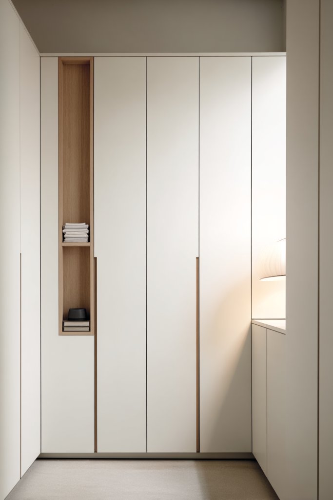 Picture a narrow, floor-to-ceiling cabinet with sleek, handle-less doors that blend into the wall. It stores toiletries, towels, and cleaning supplies out of sight yet easily accessible. The slim profile maintains open pathways and prevents visual clutter. The minimalist design enhances the sense of height and spaciousness, especially when paired with wall-mounted fixtures.
