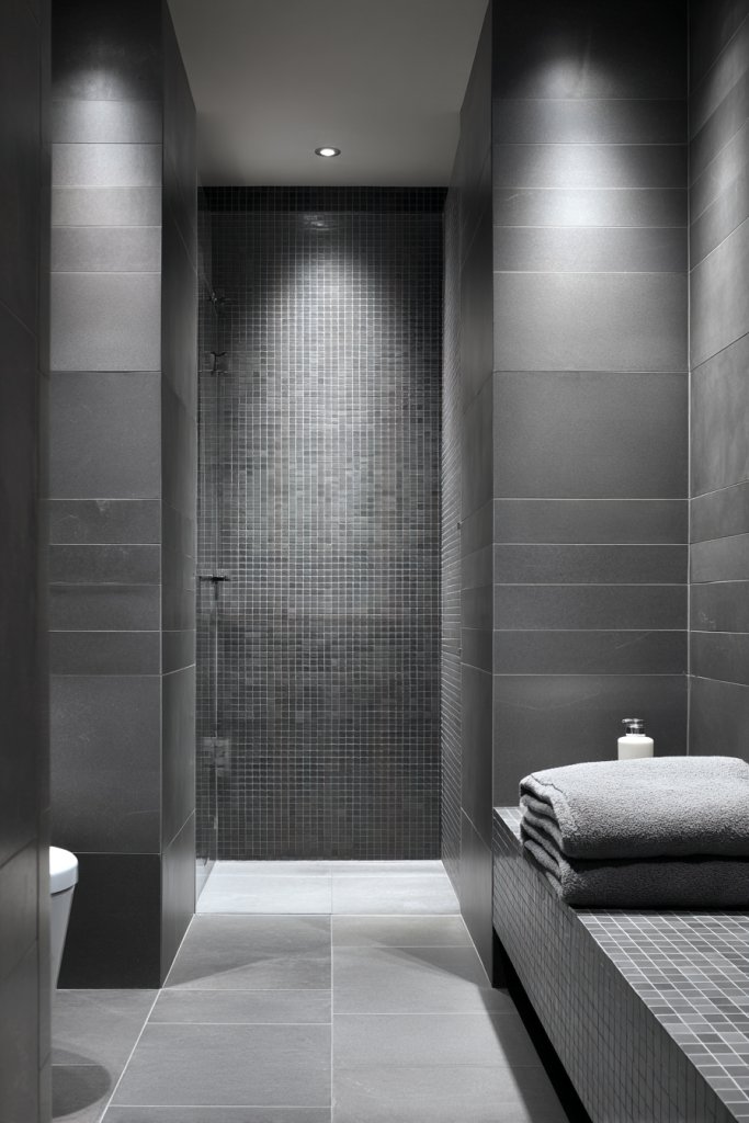 Imagine a bathroom painted in soft shades of gray, with matching tiles and fixtures. The seamless transition from wall to floor creates a unified visual flow, making the room appear larger. Matte black fixtures stand out subtly against the muted backdrop, adding depth without breaking the harmony. Textured towels and mats in similar tones enhance tactile interest, creating a sophisticated retreat.