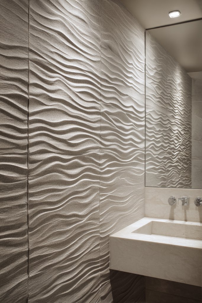 Choose from various textures—3D patterns, ripples, or embossed motifs—in neutral or bold colors. Use textured tiles as an accent wall or surround the entire room for a dramatic effect. Combine with flat tiles or painted surfaces for layered depth. Seasonal updates might include new textured panels or contrasting colors to refresh the space.