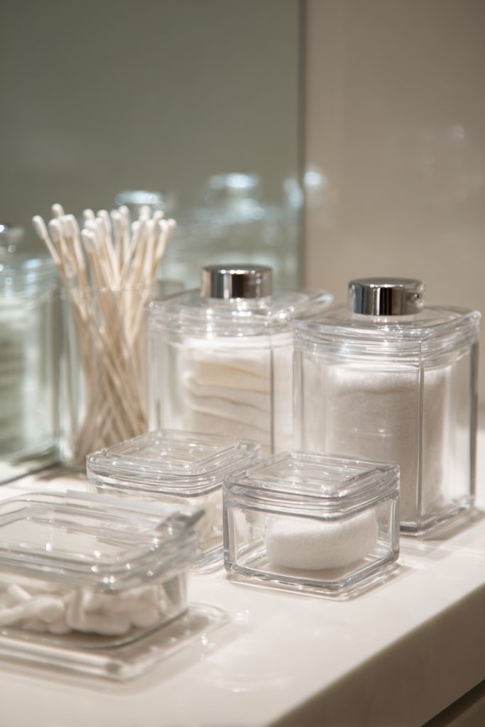 Imagine a row of transparent containers filled with colorful bath salts, cotton pads, or skincare products. Their uniform shape and clarity create a clean, organized visual effect. The contents become part of the decor, adding pops of color or texture. The sleek design complements minimalist or contemporary styles effortlessly.