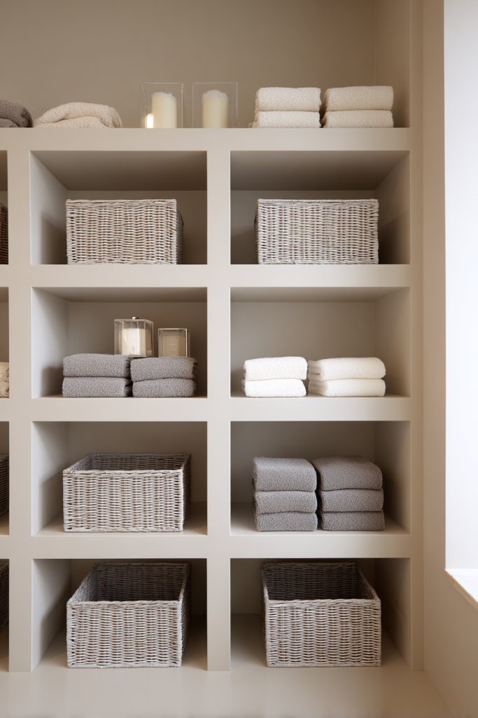 Choose baskets or containers in natural fibers like wicker, seagrass, or fabric-lined options. Use uniform sizes or vary heights for visual interest. Install adjustable shelves for flexibility and consider adding a few decorative accents like small plants or candles, if restrictions permit. Seasonal updates include changing basket colors or contents.