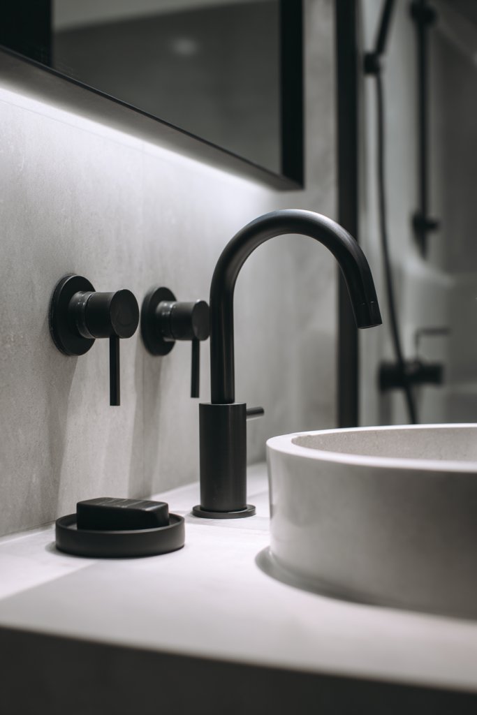 Mix matte black with other finishes like brushed gold or stainless steel for a layered look. Use black hardware on cabinets, mirrors, and towel bars to unify the aesthetic. For a more industrial style, pair with exposed piping or concrete surfaces. Seasonal accents can include warm textiles or textured mats that soften the boldness of black fixtures.