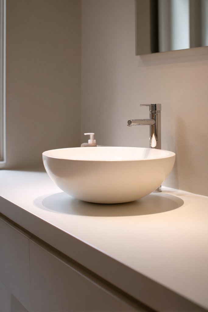 A minimalist vessel sink on a slim countertop transforms your bathroom into a sleek, contemporary space. It’s a perfect choice for small bathrooms or those seeking a clutter-free aesthetic. When paired with the right fixtures and accessories, it creates a spa-like retreat you’ll love. Ready to make a sculptural statement?