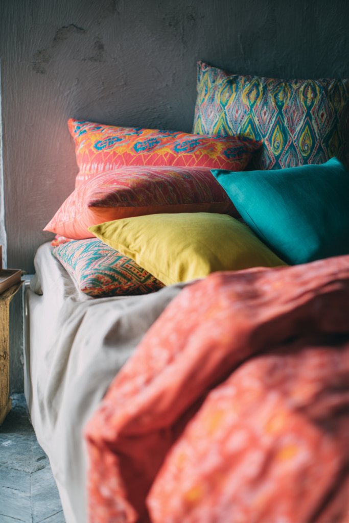 24. Vibrant Patterned Pillows and Bedding on Minimalist Furniture