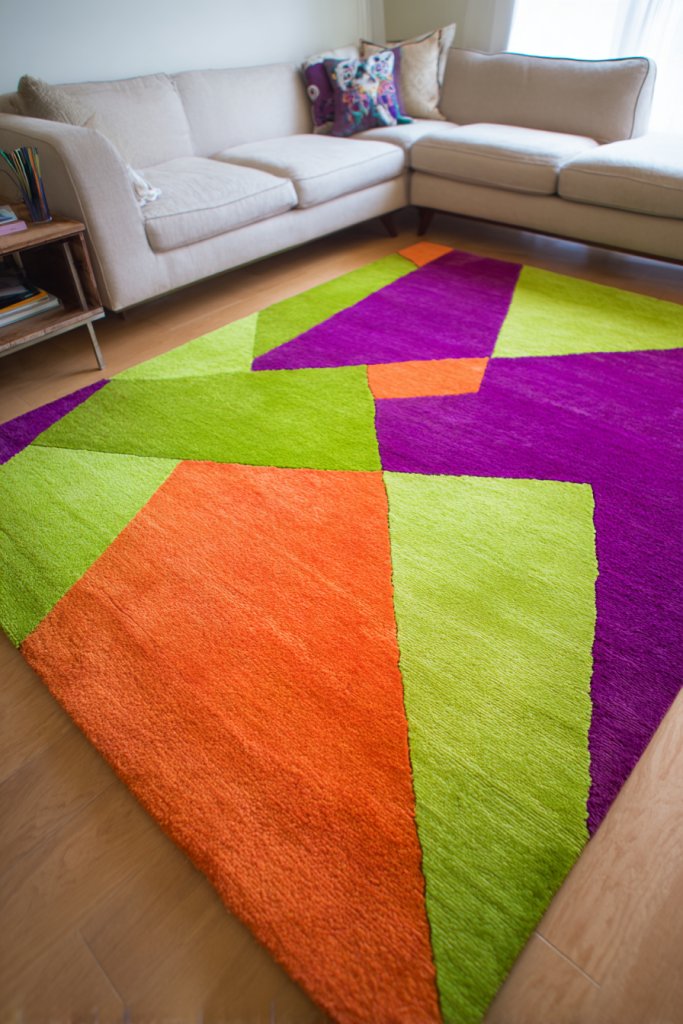 Picture a large geometric rug with bold triangles or zigzags in vibrant hues like electric blue, fiery orange, or lime green. The textured surface invites you to kick off your shoes and relax. The pattern’s sharp lines contrast beautifully against neutral furniture, adding visual energy. The plush pile provides comfort and sound absorption, making your space feel inviting. It’s like a piece of wearable art under your feet, transforming the whole room.