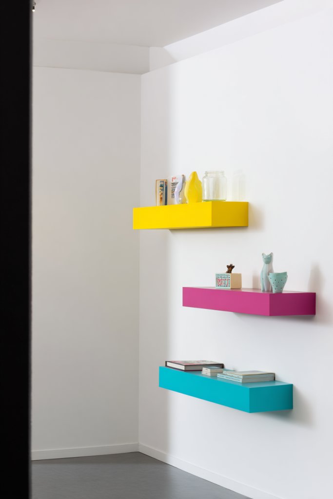 Visualize floating shelves painted in bright hues—think bold reds, lively blues, or sunny yellows—mounted against a neutral wall. They hold a curated collection of books, decorative boxes, or quirky souvenirs. The vivid colors contrast with the background, creating a layered, vibrant display. The sleek design of modern shelves adds a minimalist, yet lively touch. They draw the eye upward, making your space feel larger and more dynamic.
