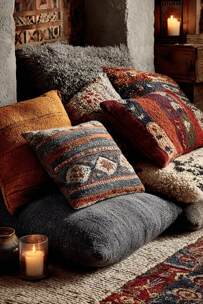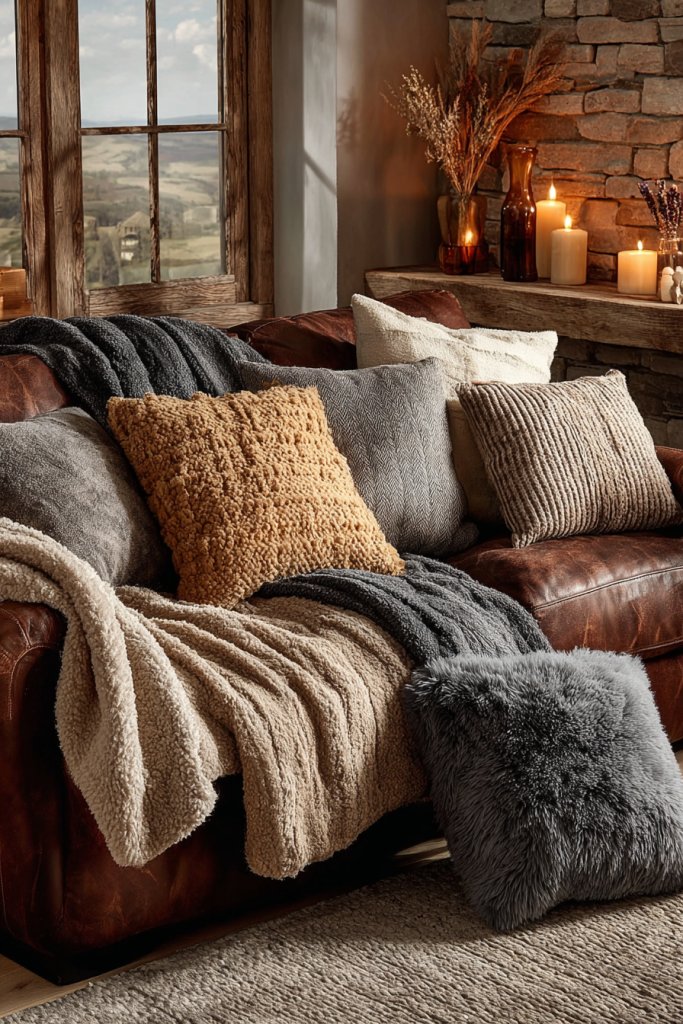 1. Layered Soft Throw Blankets and Cushions for Inviting Comfort