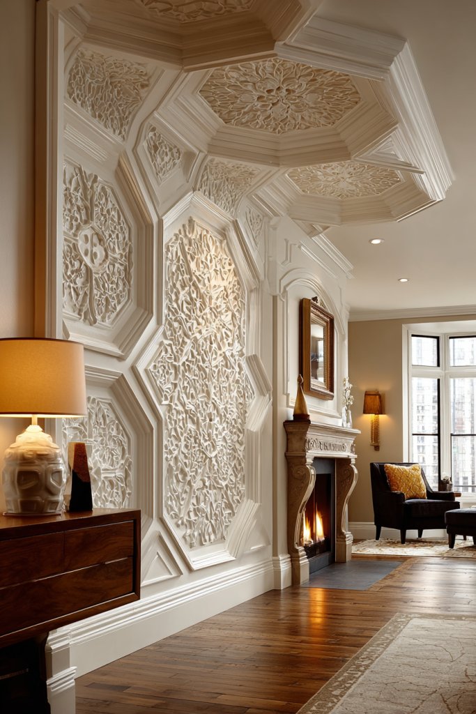 Imagine wooden or fabric-textured wall panels in a herringbone or geometric pattern, adding tactile dimension to your walls. Wainscoting with beadboard or carved details wraps around the lower half of the walls, creating a classic, cozy vibe. The textured surfaces catch light differently, adding shadows and depth that make the room feel layered and warm.