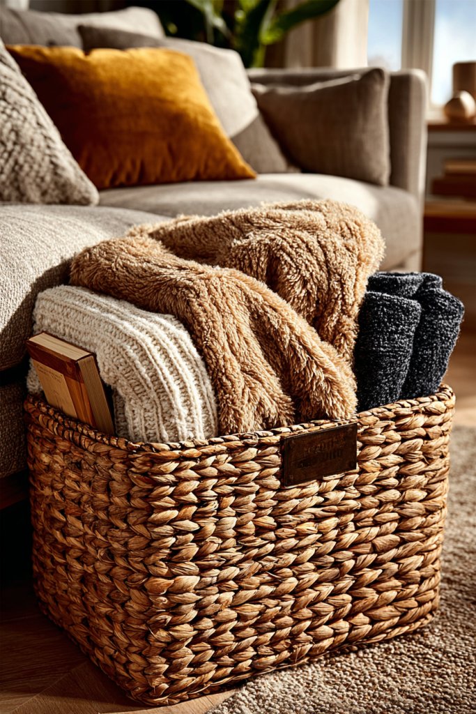 Imagine woven rattan baskets in warm natural tones placed beside your sofa or under side tables. They’re filled with throws, magazines, or toys, neatly tucked away but easily accessible. The textured baskets add a layer of visual interest and complement textured textiles and earthy hues. When organized well, they make your space look effortlessly tidy and inviting.