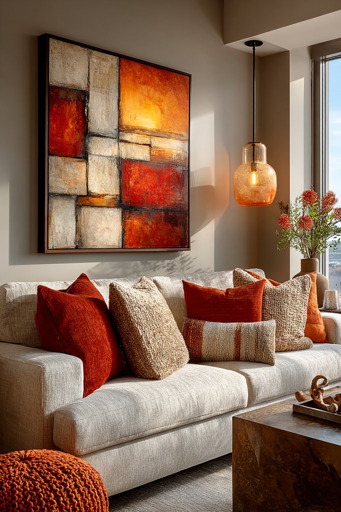 Opt for large statement pieces or a gallery wall of smaller abstracts. Mix different textures—matte, glossy, or textured canvases—for visual depth. Keep frames simple or go for frameless pieces for a modern look. Incorporate other warm-toned accents in cushions or throws to tie everything together.