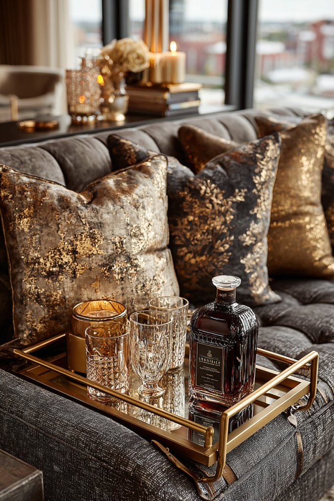 Imagine a sleek, vintage-inspired bar cart in warm brass or matte black, filled with bottles, glasses, and a few decorative accents. It’s positioned near the seating area, ready for spontaneous cocktails or mocktails. The cart’s surface is layered with textured coasters, a small bowl for snacks, and a candle or two for ambiance. The setup invites guests to help themselves and adds a social vibe.