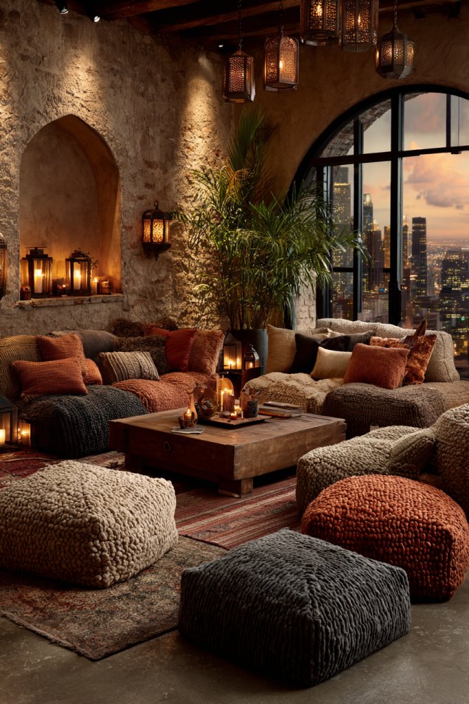 Imagine a cluster of oversized poufs in soft, textured fabrics like velvet or boucle arranged around a central coffee table or rug. The cushions are in warm, earthy tones, inviting people to sit comfortably on the floor. They add a layered, relaxed vibe to the space, perfect for laid-back conversations or movie nights. The tactile textures enhance the cozy aesthetic.