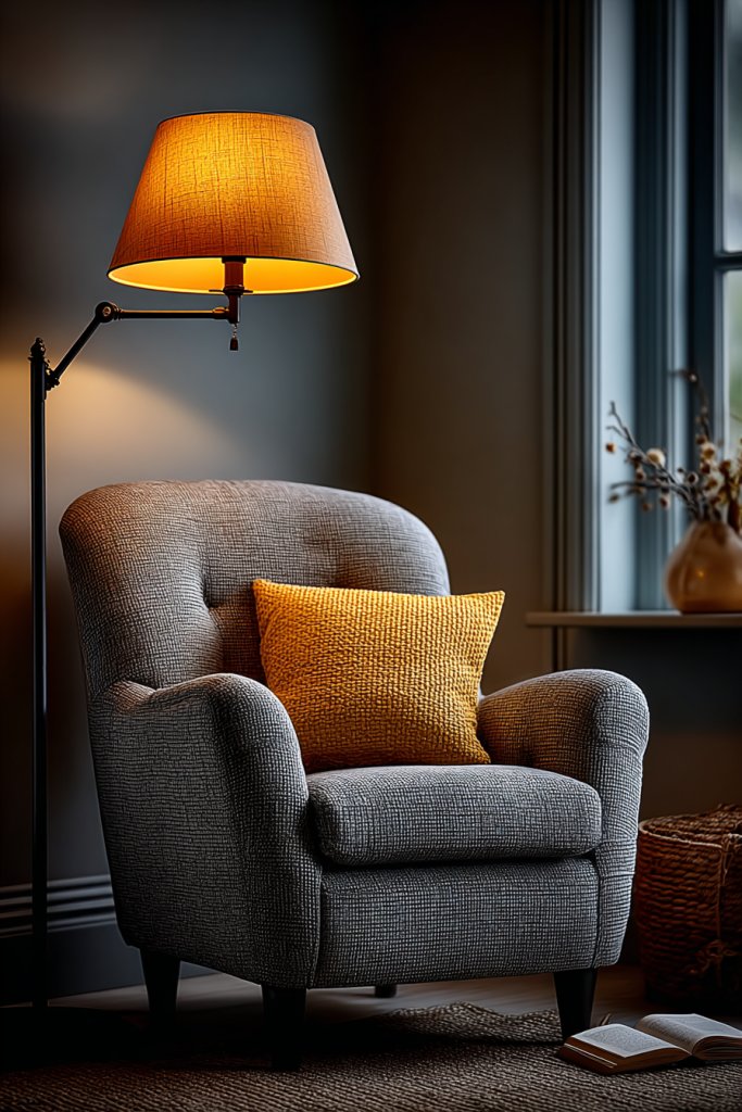 23. Design a Small Reading Nook with a Comfortable Chair and Floor Lamp