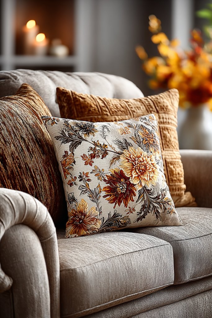 Imagine a soft grey or beige sofa adorned with a mix of patterned pillows—one with a subtle geometric print, another with a classic floral motif. The neutral base keeps the room feeling calm, while the pillows add visual interest and texture. The layering invites you to relax and settle in. It’s a versatile look that works with many decor styles.