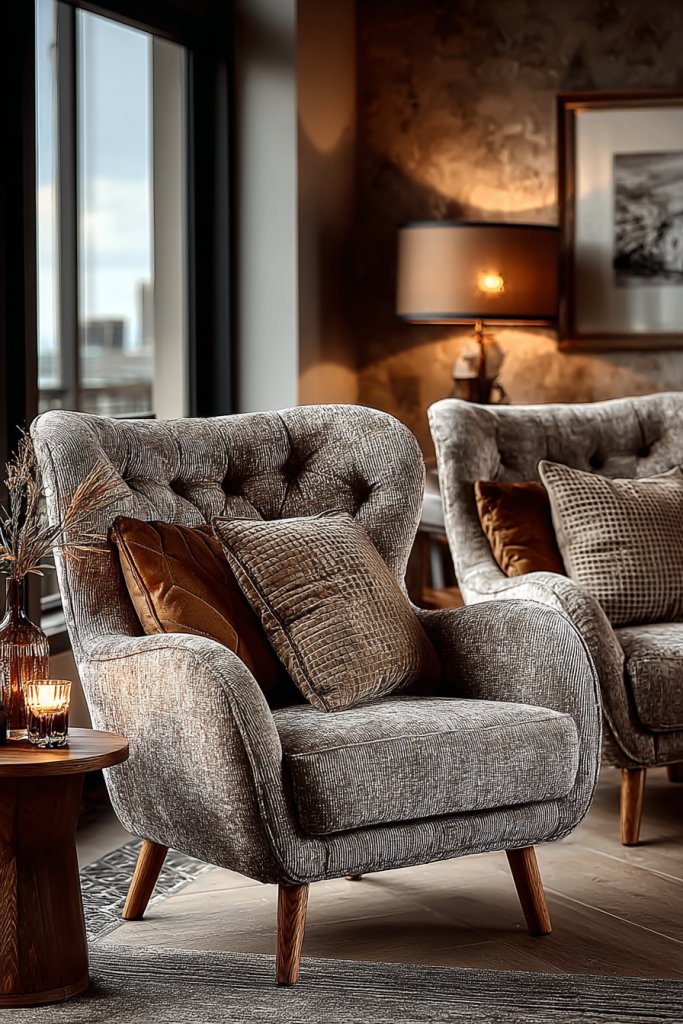 Imagine a pair of plush armchairs in soft, neutral fabric, arranged to face each other with a small, rustic side table between them. The chairs are topped with textured cushions, inviting you to sink in. Soft ambient lighting from nearby sconces or a small lamp adds warmth. The space feels intimate, perfect for quiet chats, reading, or sipping a drink.