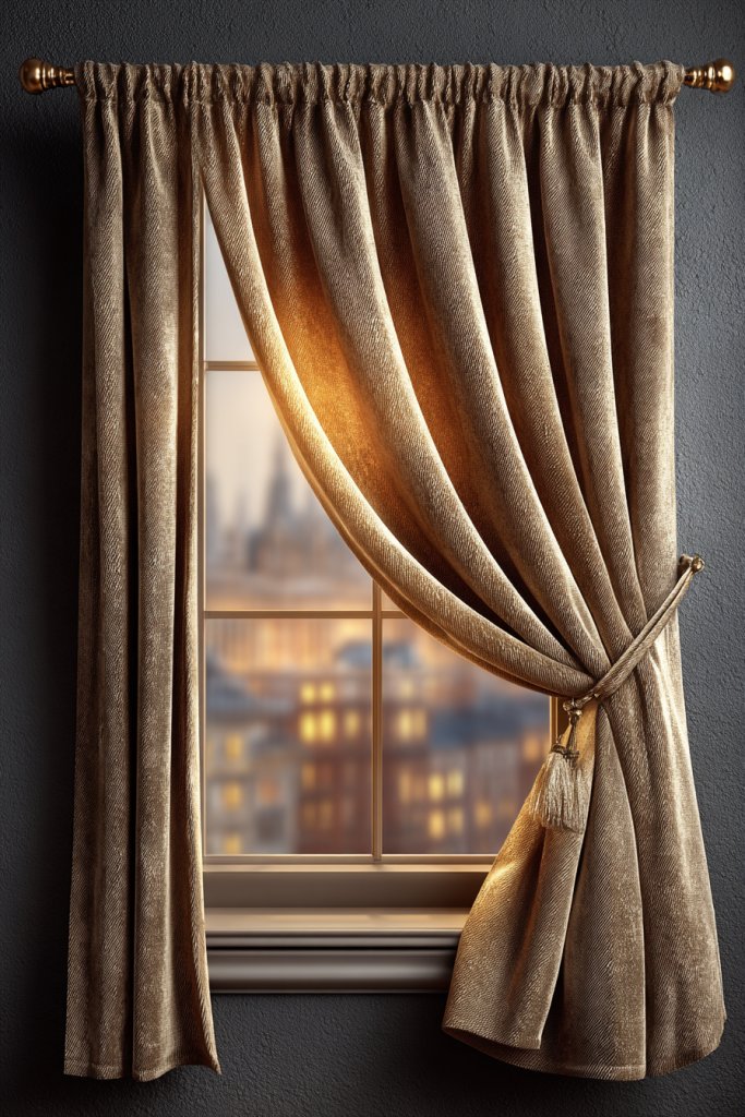Imagine thick, textured curtains in a soft taupe or warm beige fabric hanging from a matte black rod. They softly diffuse sunlight, creating a gentle glow that fills the room. When closed, they cocoon the space, adding a sense of privacy and security. The fabric’s texture adds a tactile element that invites touch and comfort.