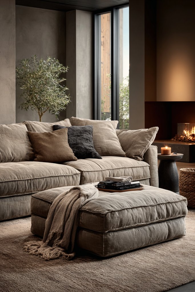Picture a sofa with a deep seat, plush cushions, and a low back in a neutral, soft fabric. Its oversized proportions invite you to stretch out, while the overstuffed cushions add a sense of hominess. Pair it with a textured throw and a few accent pillows for added comfort and visual interest. The overall look is warm, inviting, and perfect for lounging.