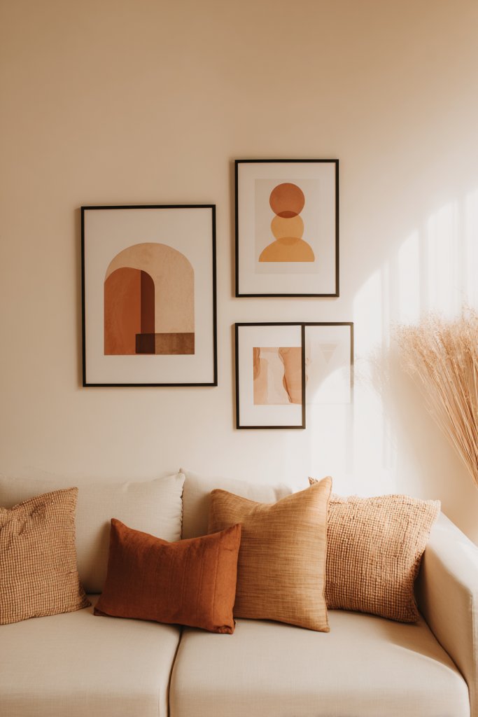 Personalize with your own photos in minimalist frames or add textured wall panels. Incorporate a mix of art styles—like geometric, abstract, or botanical—within the warm palette. Use complementary decor like woven baskets or textured ceramics nearby. Keep the overall look uncluttered and intentional.