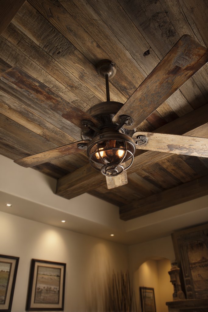Imagine a large ceiling fan with distressed wood blades or antiqued metal accents hanging from a high ceiling. Its design echoes rustic barn doors or vintage machinery, blending form with function. When turned on, the blades create a gentle motion that adds life and movement to the room. It’s both practical and decorative.