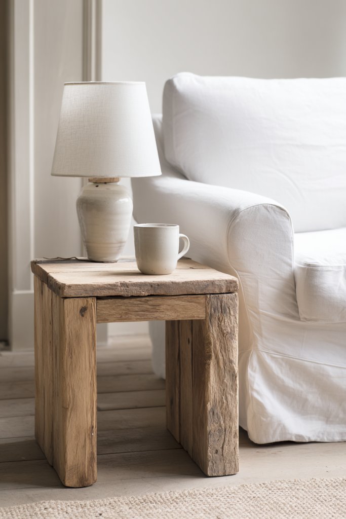 Picture a distressed wood side table with a raw, natural grain that shows off its character. It supports a ceramic mug, a vintage clock, or a small potted plant, adding warmth to the space. The table’s simple design and weathered finish make it feel like a piece that has stories to tell. It’s understated but essential.