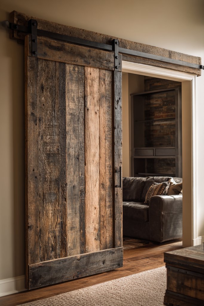 Imagine a sliding barn door with distressed white paint or natural wood finish, mounted on black iron hardware. It glides smoothly along a track, revealing or concealing a cozy nook or storage area. The door’s weathered texture and simple design evoke a rural barn or country cottage vibe, adding instant character.