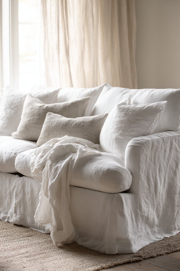 Visualize a large, plush sofa with deep cushions, wrapped in a loose, slightly wrinkled slipcover. The fabric has a matte, natural appearance—think soft linen or breathable cotton—that invites you to sink in. Tossed casually with textured cushions or throws in coordinating hues, it creates a cozy, welcoming vibe. Its relaxed silhouette adds to the overall farmhouse aesthetic.