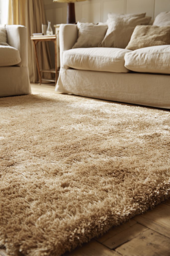 Picture a large, plush rug in a neutral hue, perhaps with a faint geometric pattern or simple solid tone. It layers over hardwood or concrete floors, softening the room’s overall feel. The textured fibers invite barefoot strolls and cozy mornings. The rug’s edges are slightly frayed or bound for a relaxed, lived-in look that complements farmhouse charm.