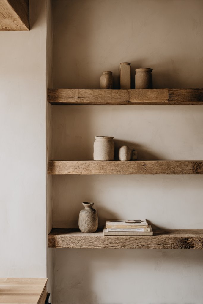 Choose open shelving in weathered wood, painted finishes, or metal for different effects. Use baskets or bins to hide clutter, leaving the top shelves for display. Mix practical storage with decorative items like glass jars or wooden signs. Adjust spacing based on your storage needs and style preference. It can work in kitchens, living rooms, or even bathrooms.