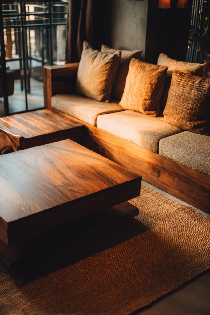Imagine rich walnut furniture with its deep, warm hue contrasting against a plush, textured rug underfoot. Soft throws and cushions in earthy tones add layers of tactile comfort, inviting you to sink in. Warm lighting highlights the wood grain, creating a cozy glow that wraps the space in serenity. The blend of natural textures makes the room feel grounded and welcoming.