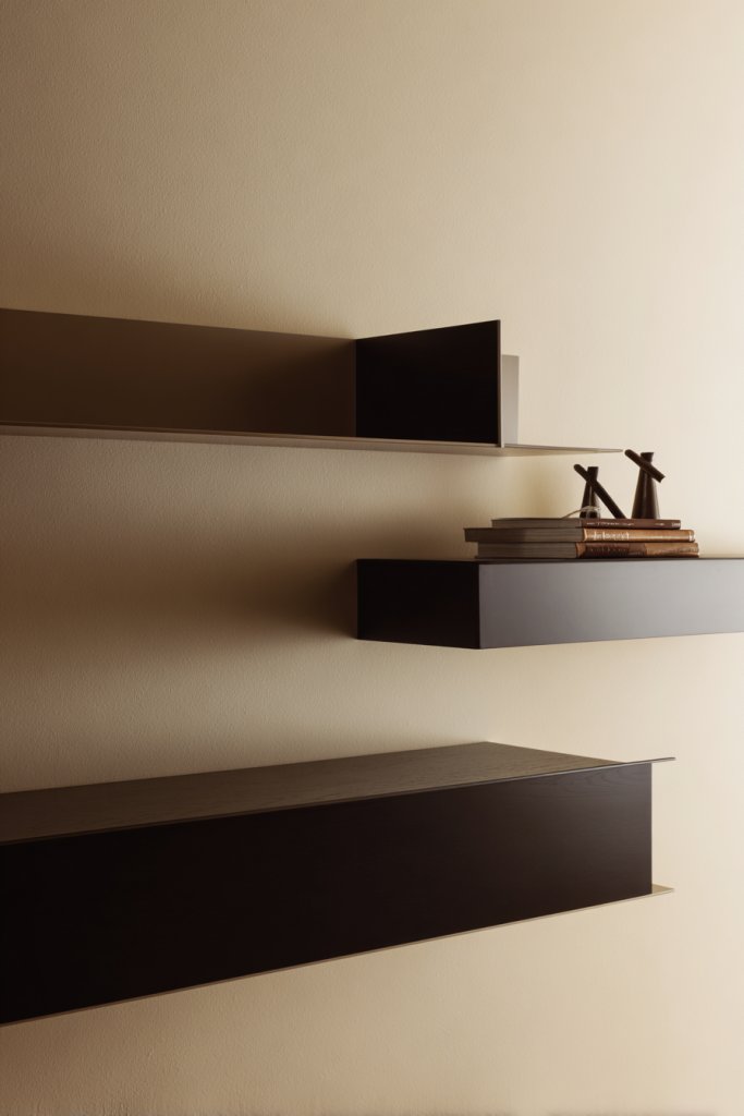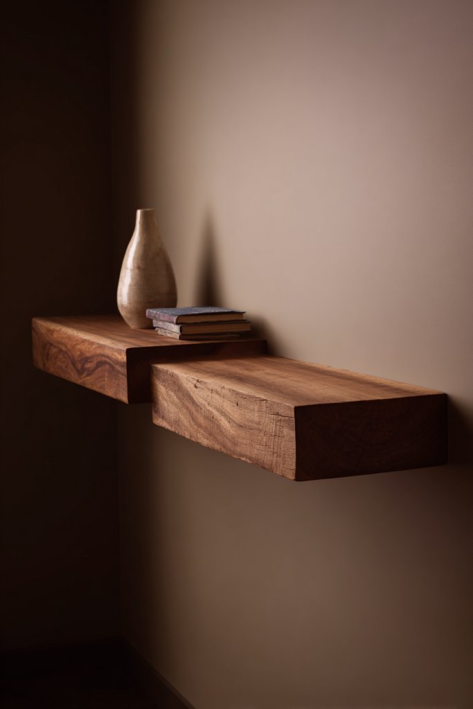 Picture slim floating shelves mounted on a textured wall, holding curated decor like ceramics, books, or sculptural objects. The dark finish contrasts beautifully with warm wall tones, creating a striking visual effect. The open design keeps the room feeling spacious while providing a platform for your favorite objects. Shadows cast by the shelves add depth and dimension.