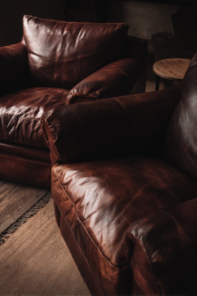 Picture a pair of plush leather armchairs nestled in a corner, accompanied by textured cushions and a warm throw. The rich, deep hues contrast against lighter rugs and wooden floors, creating a cozy nook. The natural grain and slight imperfections in the leather add authenticity, making the space feel lived-in and inviting. Soft lighting highlights the leather’s warm glow.