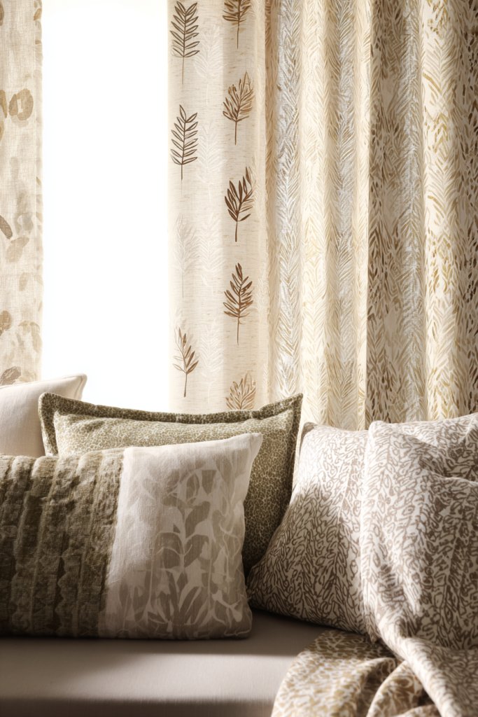 Imagine curtains with delicate terracotta, rust, or stone patterns fluttering softly, filtering warm sunlight. Cushions in matching or complementary prints adorn your sofa, adding texture and visual depth. The patterns evoke natural elements like rocks, soil, or bark, reinforcing the earthy theme. The overall effect is cozy and inviting, with a touch of organic charm.