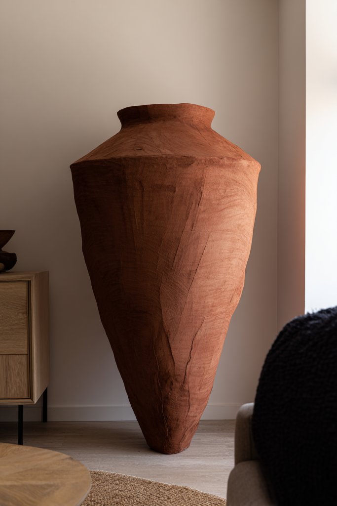 Imagine a large, unglazed terracotta vase filled with dried botanicals or standing empty as a sculptural element. Its rough texture and warm hue draw the eye, creating a visual anchor in the room. Surround it with layered textiles, wooden furniture, or textured walls for a cohesive earthy vibe. The vase’s size and simplicity make it a powerful design statement.