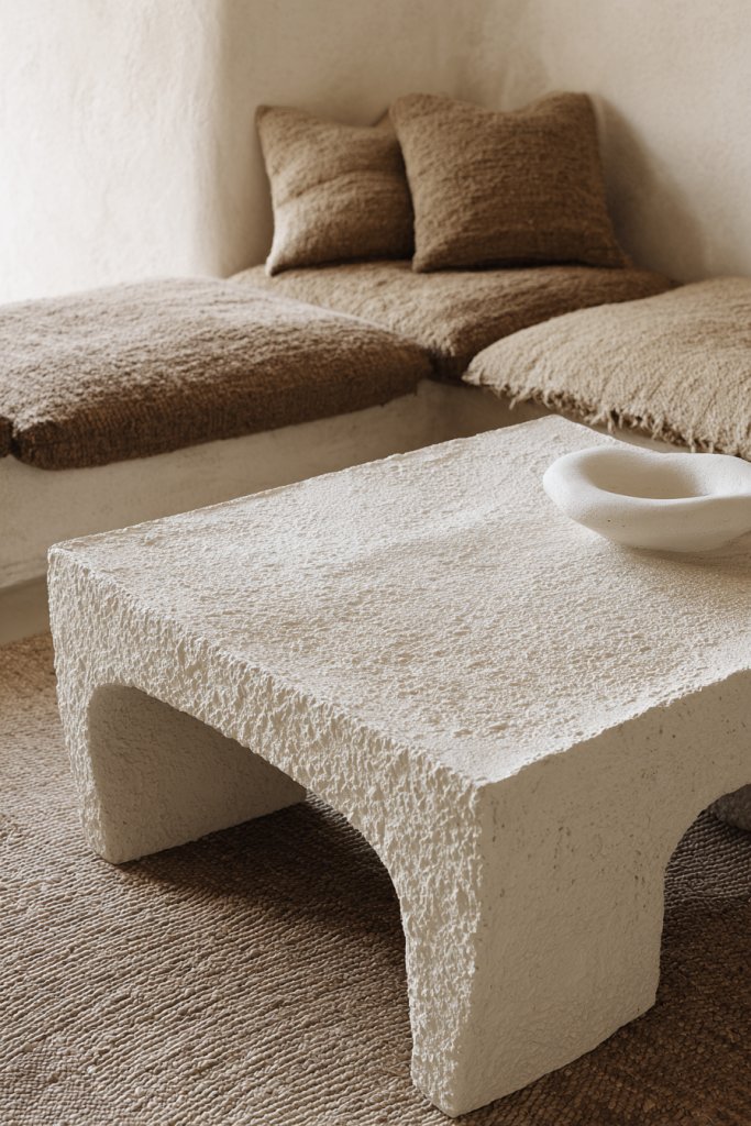 Picture a sturdy concrete table with a matte finish, paired with warm-toned textiles and soft lighting. Its rough texture contrasts with plush cushions and woven rugs, creating a layered aesthetic. The natural, muted color palette of clay or concrete adds a neutral yet tactile element that enhances the earthy vibe. Shadows and light accentuate the textured surface, making the piece pop.
