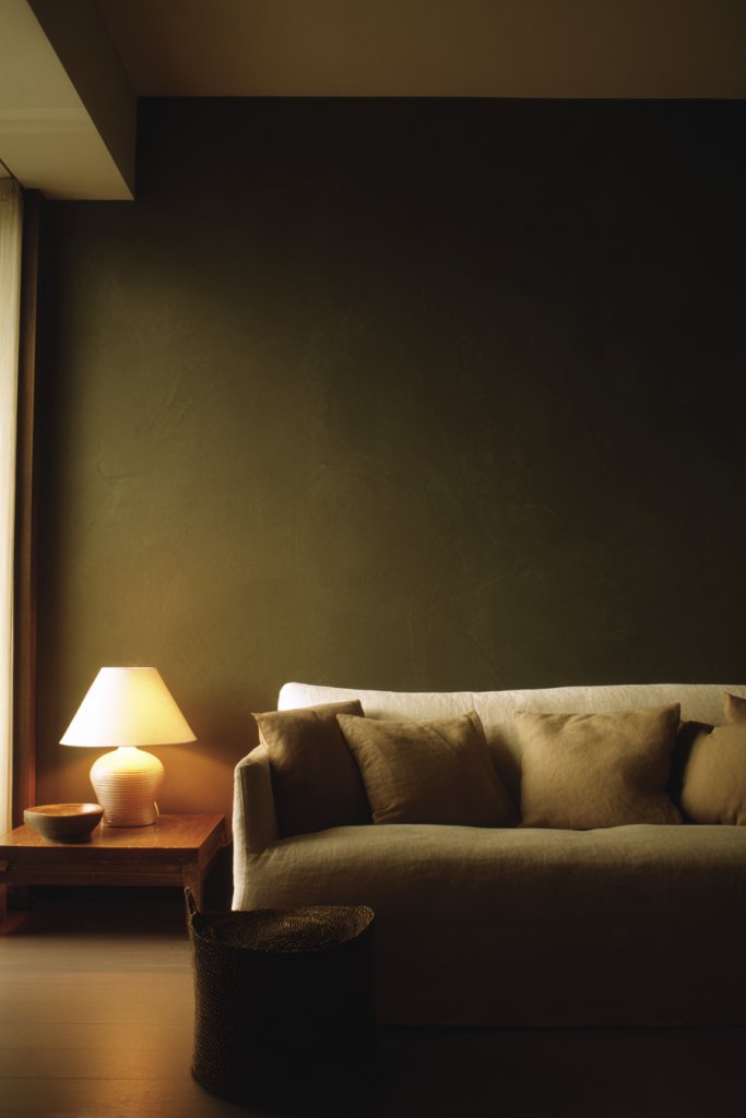 Picture a wall painted in a lush olive green, enveloping the room in a calming embrace. Accentuated by warm-toned cushions and soft lighting, the space feels intimate yet alive. The matte finish absorbs light softly, creating a subtle, velvety texture. Natural wood or woven elements nearby enhance the earthy, grounded vibe.