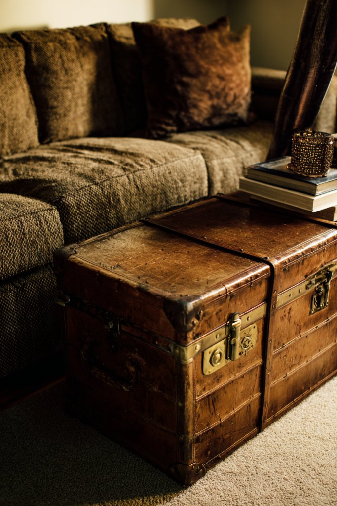 Picture a weathered leather trunk placed at the foot of a sofa, topped with a textured throw or decorative tray. Its aged surface and rich patina tell a story of craftsmanship and history. The trunk’s size and presence create a focal point, blending functional storage with style. Nearby, woven or wooden accents enhance the vintage vibe.