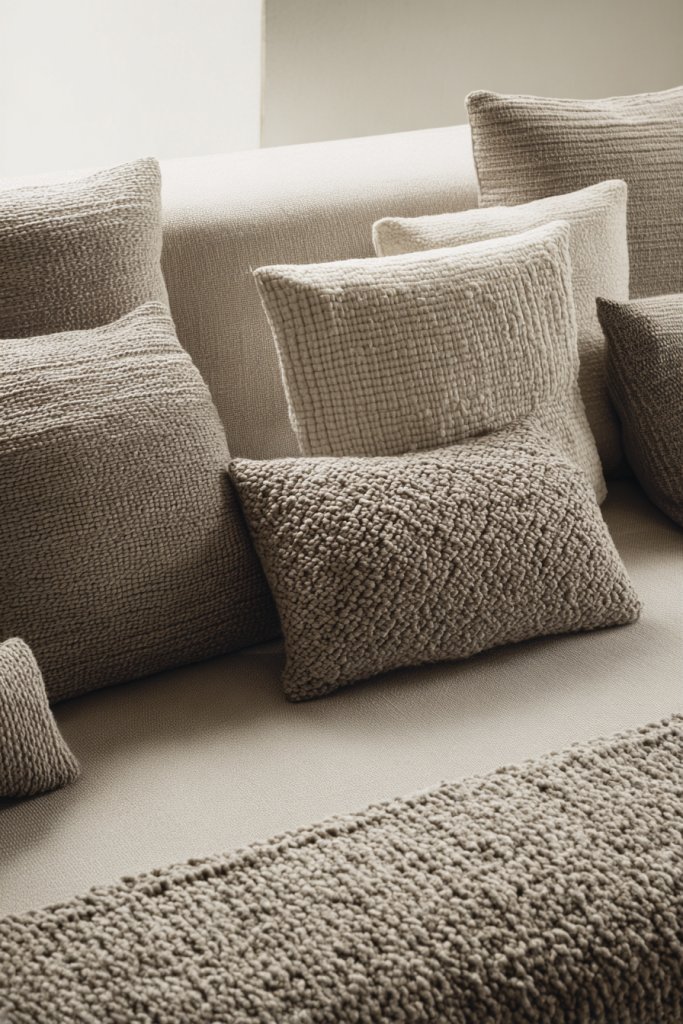 Imagine a sofa covered with cushions in shades of taupe, sand, and rust, featuring textures like chunky knit, boucle, or woven straw. The tactile variety invites you to touch and relax. Their understated tones blend seamlessly with wood and stone accents, creating a calm, cohesive environment. Light plays softly on the textured surfaces, enhancing their warmth.
