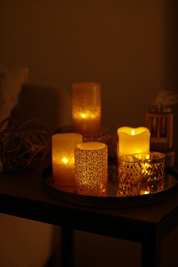 Picture bronze or matte black candle holders with flameless candles arranged on a mantle or coffee table. The warm glow enhances textured rugs, wooden furniture, and earthy decor elements. The flickering light creates a calming atmosphere, perfect for unwinding or entertaining. The subtle shimmer of metallic holders adds a touch of elegance.