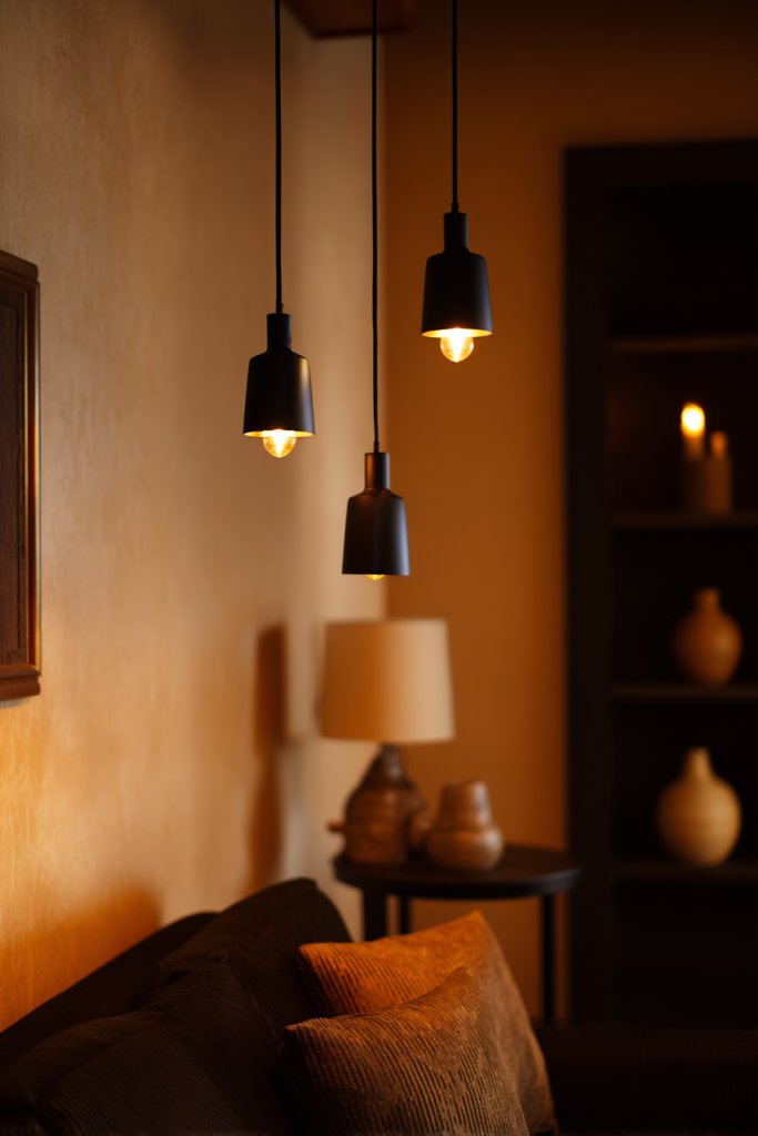 Imagine sleek matte black pendant lights hanging above a textured coffee table, casting a warm amber glow. Wall sconces in the same finish flank a deep-toned accent wall, creating pools of gentle light. The warm bulbs offset the starkness of black fixtures, adding softness and ambiance. Shadows dance softly across the room, making it feel intimate and layered.