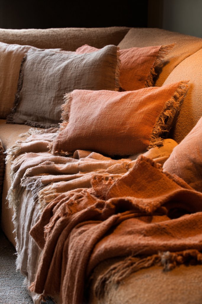 4. Rustic Clay-Toned Throw Pillows and Blankets