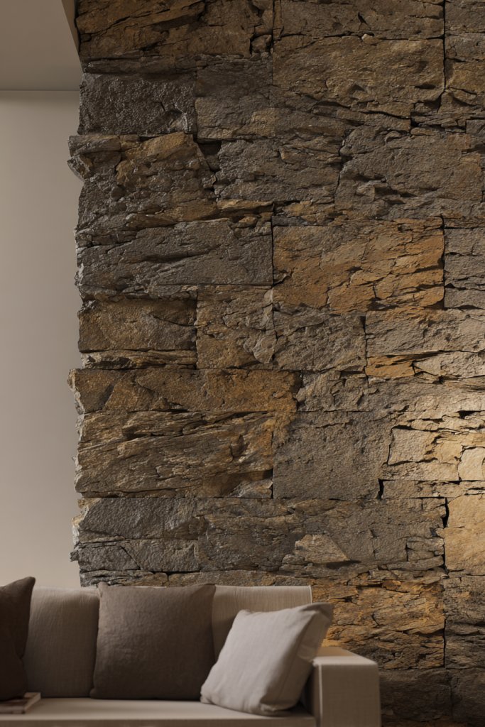 Visualize a feature wall clad in textured stone-look panels in warm, earthy tones—think sandy beige or muted taupe. The rough surface catches light differently throughout the day, creating subtle shadows and visual depth. Paired with smooth wood furniture and soft textiles, the contrast feels organic and balanced. The panels add a rugged, natural charm that anchors the room.