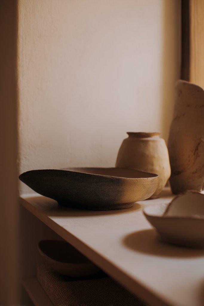 Picture a collection of handcrafted clay vases and bowls in muted terracotta, ochre, and sandy hues arranged on open shelves or side tables. Their matte, unglazed surface catches the light softly, emphasizing their natural origin. Dried botanicals or simple candles inside these ceramics create a cozy, rustic display. The variations in shape and size add visual interest while keeping things organic.