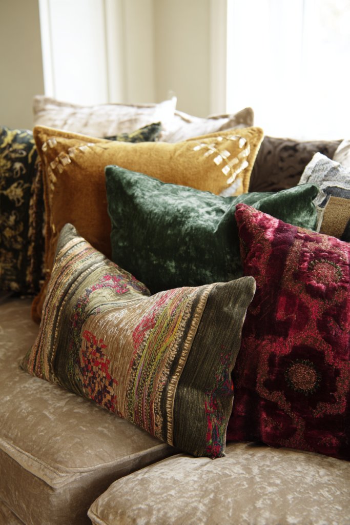 Visualize a sofa layered with pillows in bold geometric, floral, and abstract prints. Mix textures like velvet, leather, and woven fabrics to create depth. Bright colors—think jewel tones or contrasting neons—add vibrancy and energy. The layered arrangement invites your touch and makes the space feel inviting and lived-in.
