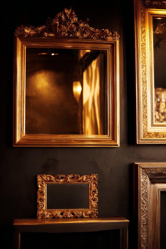 Picture a wall adorned with a collection of vintage mirrors in various shapes and sizes, all framed in gilded or distressed wood. Their reflections bounce light around the room, creating depth. Ornate frames with intricate carvings add texture and richness, turning wall decor into art. The mix of old and new creates a layered, glamorous look.