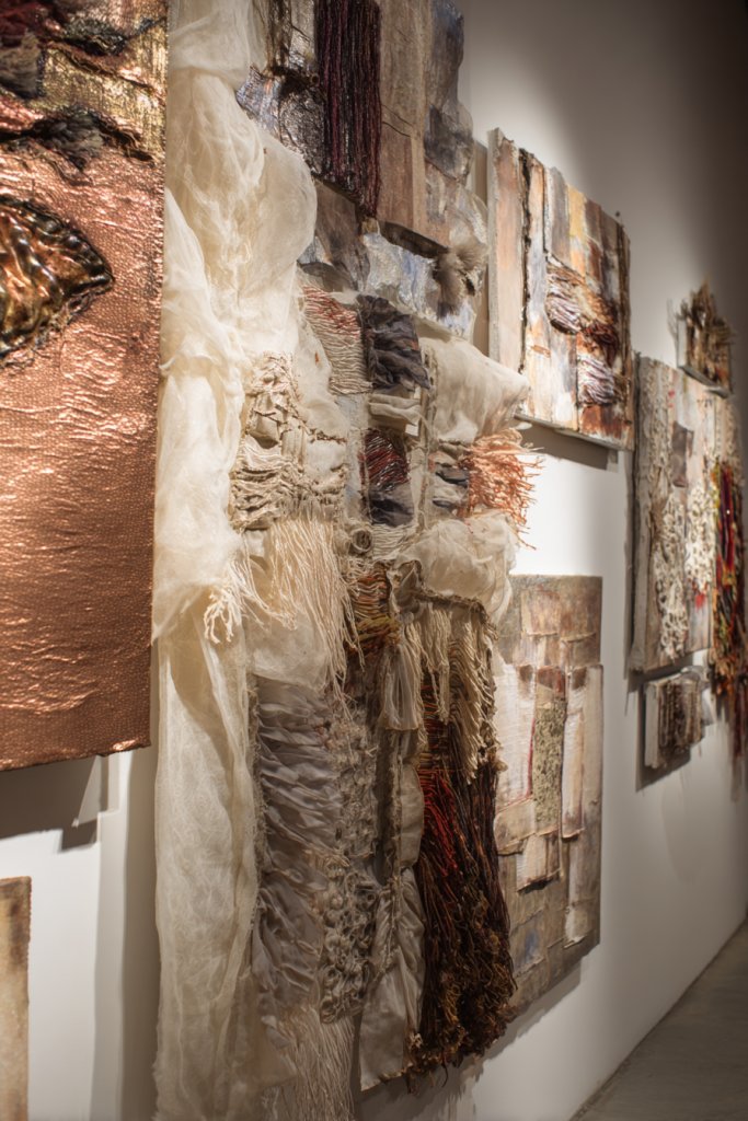 Picture a canvas layered with woven fibers, metallic leaf accents, and painted textures. Or a wall collage combining fabric, wood, and painted elements for a tactile, multi-layered display. The mix of materials creates a rich, dynamic visual that evolves as you move around the room. It’s art that feels alive.